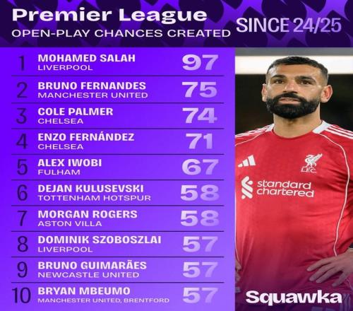 据数据网站Squawka统计,自2024-25赛季以来,萨拉赫是英超运动战创造机会次数最多的球员,布鲁诺-费尔南德斯排名第二。