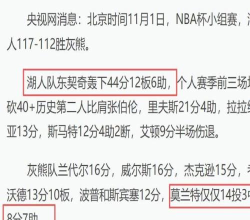 而湖人队的东契奇复出的第一场比赛就拿到了44分12板6助,而里夫斯也拿到了21分4板4助。