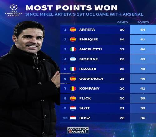 自阿尔特塔率阿森纳欧冠首秀以来主帅积分榜: